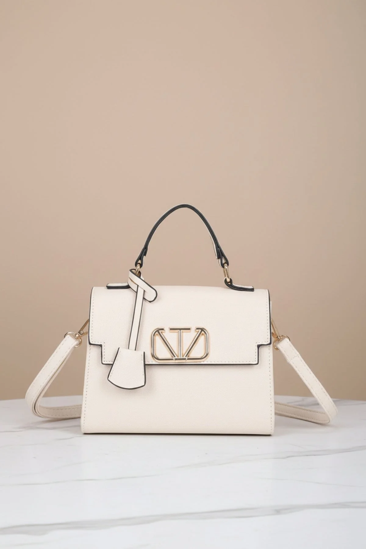 Beige Grab Handle Flap Bag