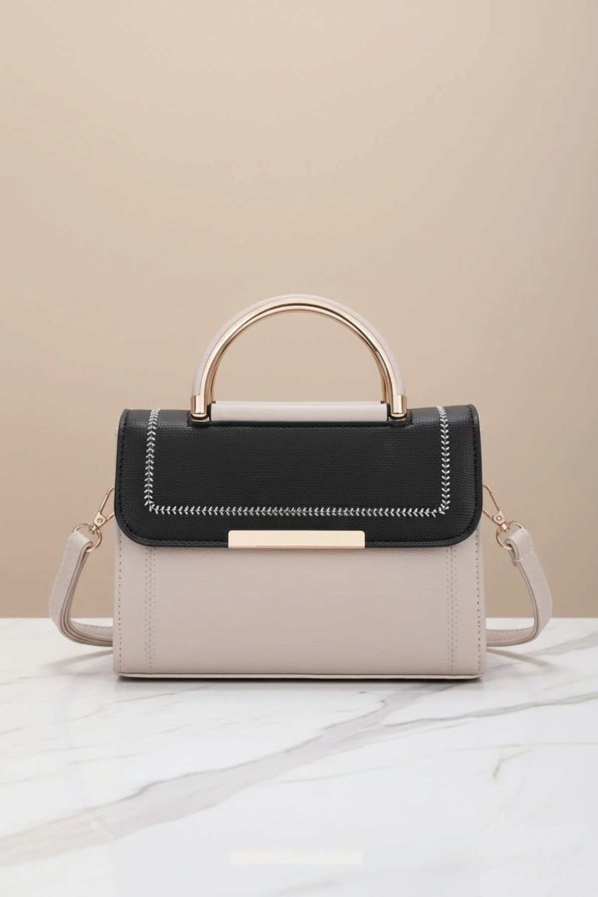Black & Beige Colour Block Top Handle Flap Bag