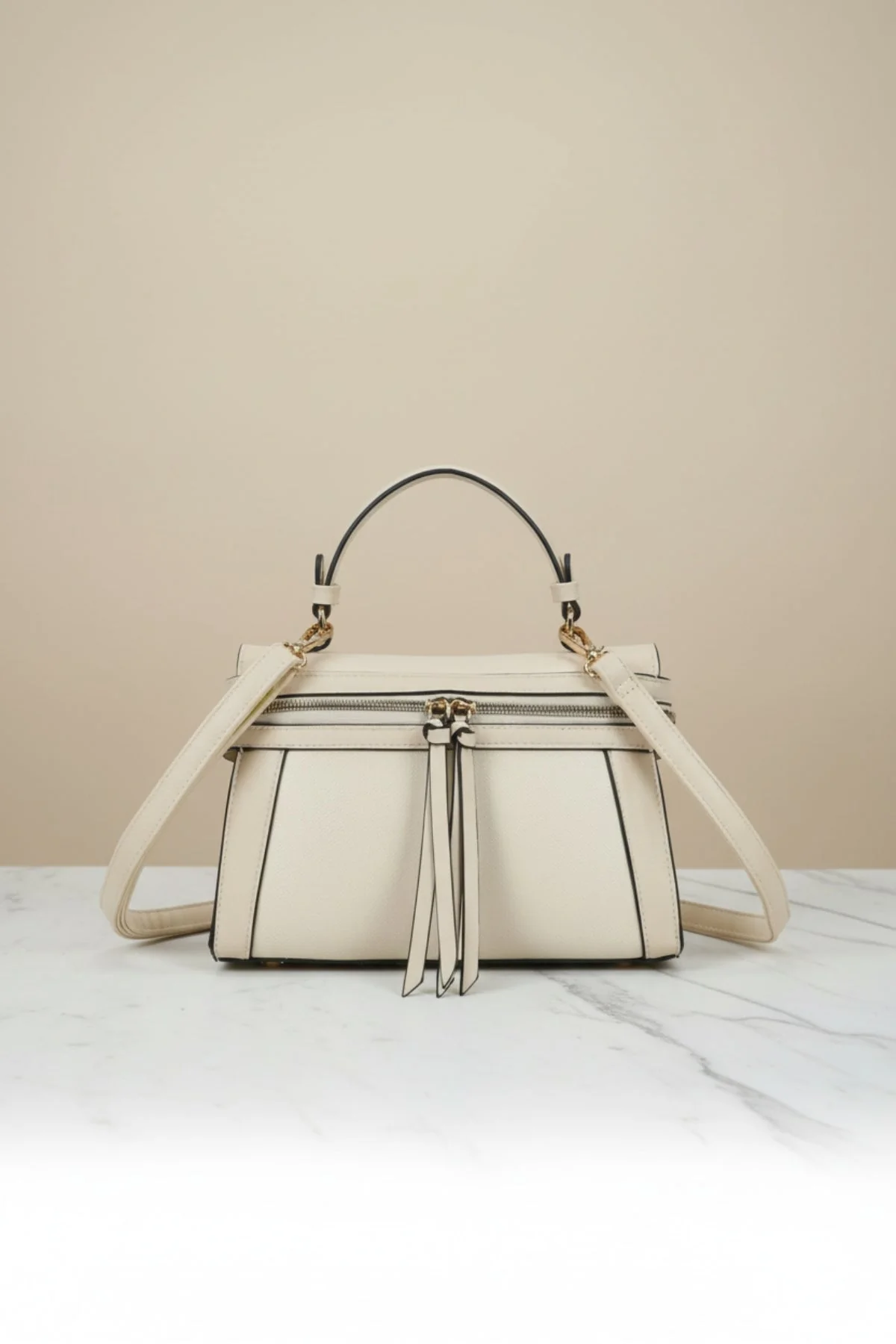 Beige Zip Detail Grab Handle Bag