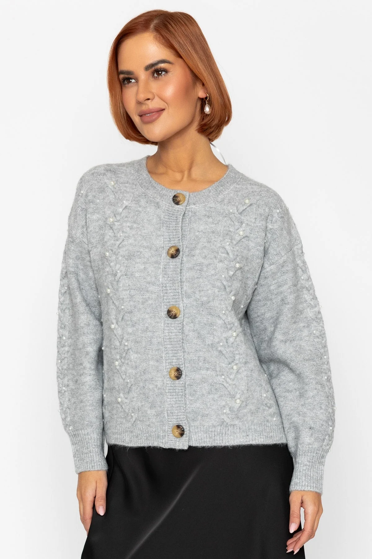 Fine Gauge Crew Neck Cardigan in Oatmeal Beige