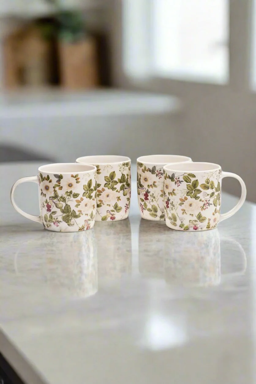 Set of 4 Cream Floral Rose Mugs
