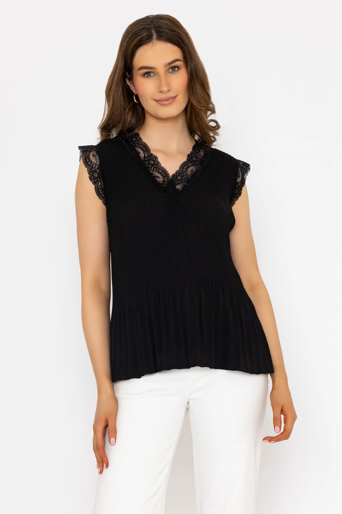 Black Sleeveless Lace Trim Pleat Top