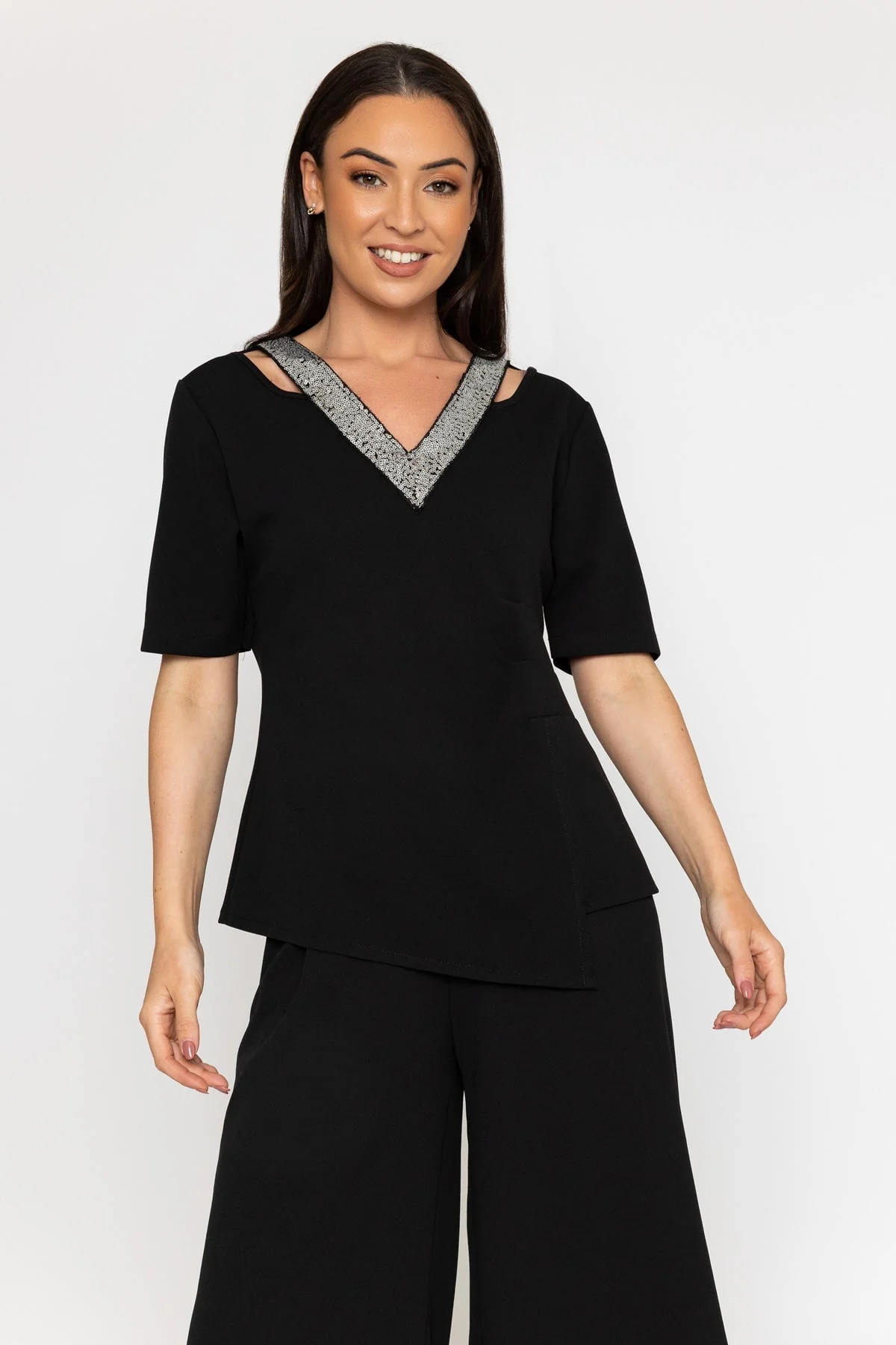 Black Sequin Trim V-Neck Top