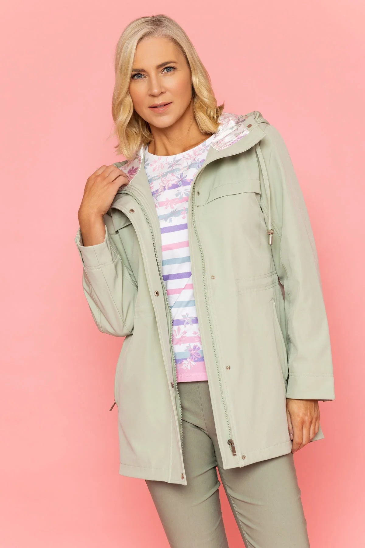 Drawstring Mac With Printed Hood Lining in Sage